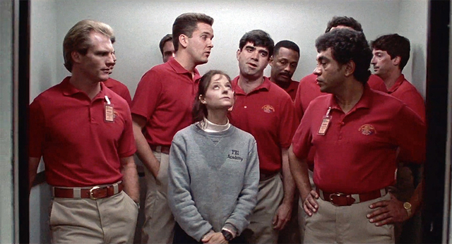 We see Starling in sweaty gym clothes, the 5'3" Foster surrounded in an elevator by male FBI academy students in red golf shirts. The ambitious and repulsive Dr. Chilton (Anthony Heald), Lecter's captor, flirts with her, and Demme's camera pans around a room full of uniformed county deputies in a small-town funeral home as they size up and/or ogle Starling when she arrives to assist Crawford on a murder victim's autopsy.