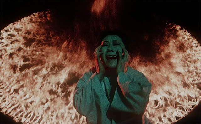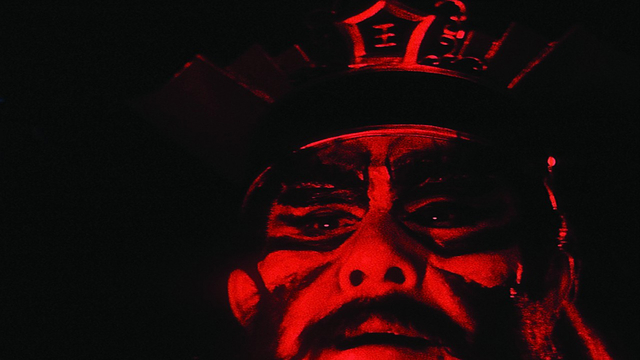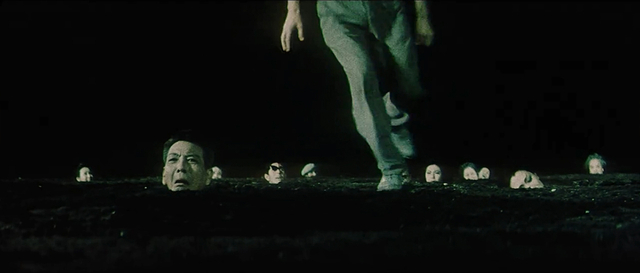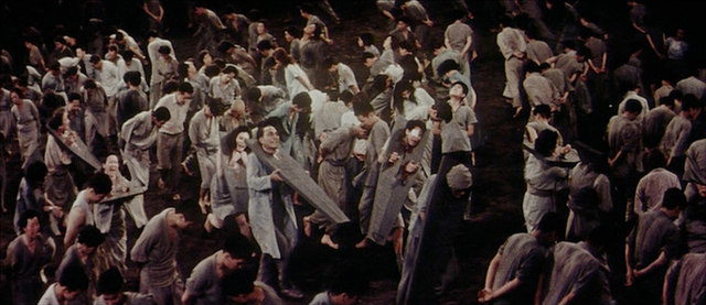 With Shintoho collapsing into bankruptcy, Nakagawa and his crew had to be very creative, and the director ended up spending his own money to get the film finished. They had the use of a huge soundstage but little money for sets, so the torments of hell are portrayed against inky blacks, and rudimentary special effects were deployed, like coloured dyes swirled in a tub of water. Extras, committed to getting the film finished, were buried in holes that they dug themselves.