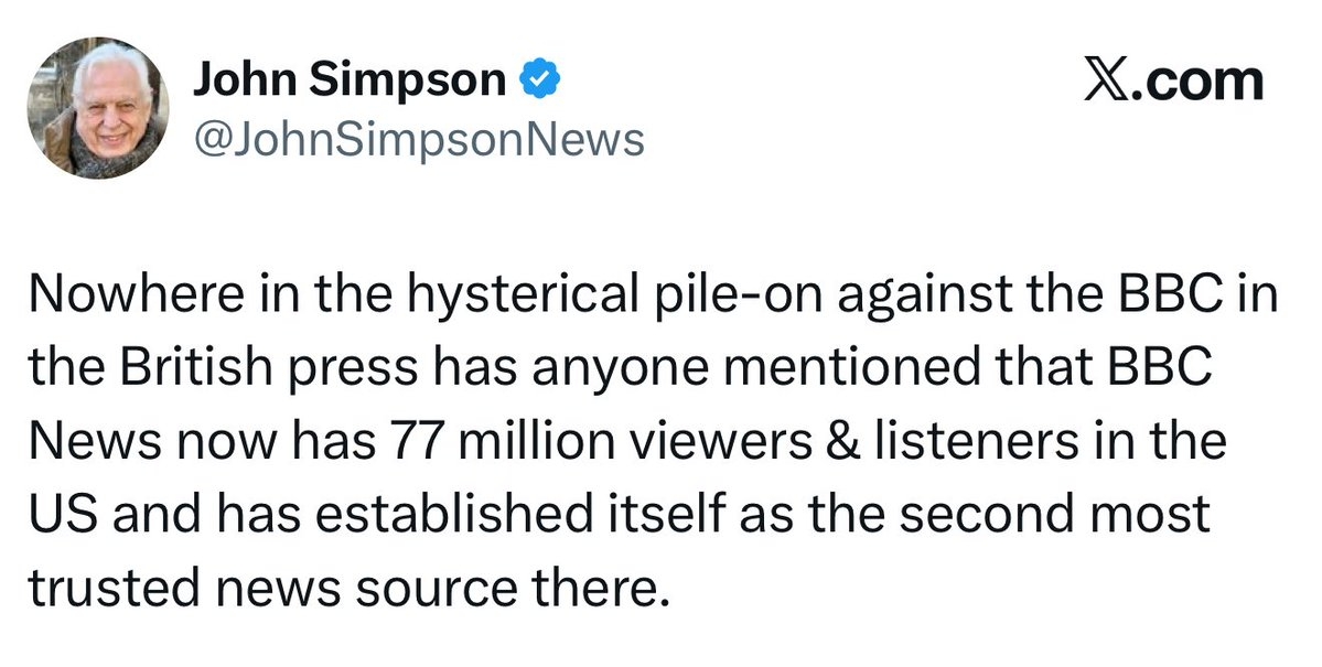 Lots going on in the world, including a letter from Donald Trump's Florida lawyer to the BBC threatening to file a defamation suit for one billion dollars! The Beeb establishment reacted with its usual invincible smugness. Its World Affairs Editor John Simpson has been a fixture on UK telly screens for almost six decades (he accompanied the Ayatollah Khomeini on his flight from Paris back to Teheran) and thought this an appropriate response to the resignation in disgrace of the Director-General and his Head of News: